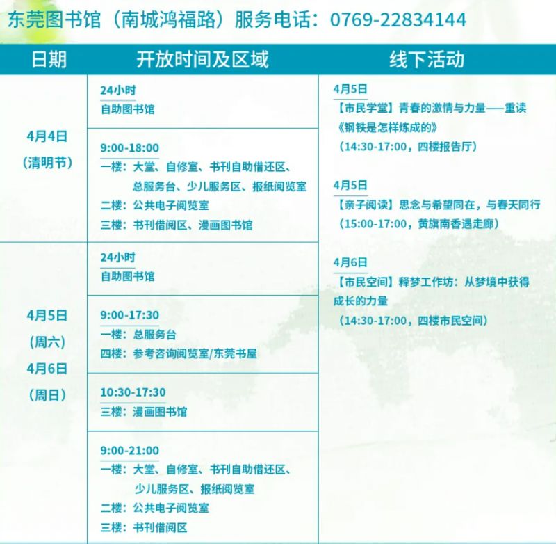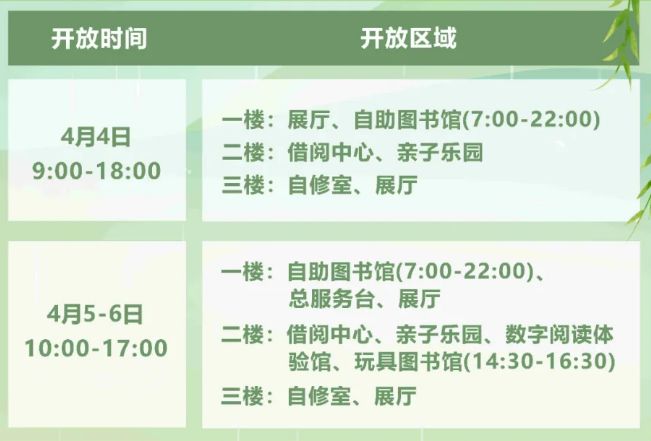 根据国务院办公厅《关于2025年部分节假日安排的通知》,2025年清明节(4月4-6日)东莞图书馆开放时间与区域如下: