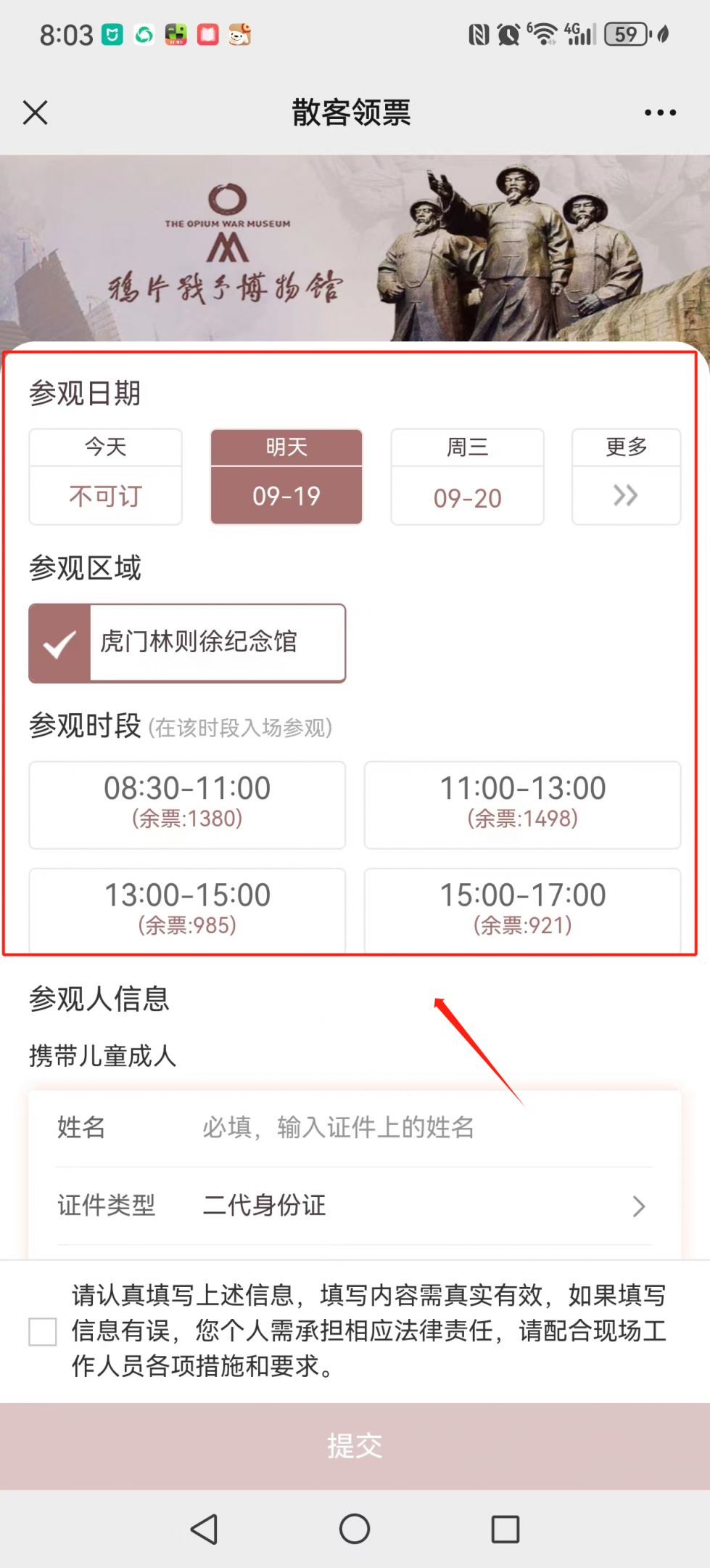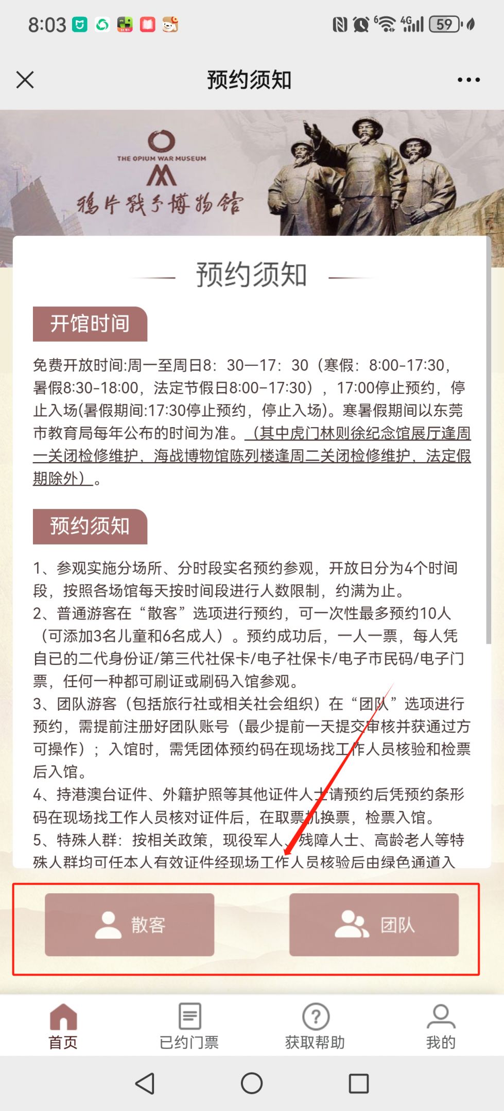 》》》东莞虎门林则徐纪念馆怎么预约(入口+流程) 预约方式: 观众需通过鸦片战争博物馆微信公众号预约参观。鸦片战争博物馆实行实名制参观,入馆参观前,观众需携带身份证或其它有效身份证件。 预约入口:点此进入 预约流程: 1、进入“鸦片战争博物馆”微信公众号,在菜单栏找到“门票预约”进入,也可直接点击本文上方预约入口进入);  2、可选择海战博物馆及威远炮台、虎门林则徐纪念馆、沙角炮台等;  3、这里以虎门林则徐纪念馆为例,点击进入后阅读“预约须知”,选择“散客”或“团队”;  4、进入下一界面后,选择参观日期、参观时段、填写参观人信息后,点击“提交”;  5、预约成功,刷身份证入馆。 预约须知: 1、参观实施分场所、分时段实名预约参观,开放日分为4个时间段,按照各场馆每天按时间段进行人数限制,约满为止。 2、普通游客在“散客”选项进行预约,可一次性最多预约10人(可添加3名儿童和6名成人)。预约成功后,一人一票,每人凭自已的二代身份证/第三代社保卡/电子社保卡/电子市民码/电子门票,任何一种都可刷证或刷码入馆参观。 3、团队游客(包括旅行社或相关社会组织)在“团队”选项进行预约,需提前注册好团队账号(最少提前一天提交审核并获通过方可操作);入馆时,需凭团体预约码在现场找工作人员核验和检票后入馆。 4、持港澳台证件、外籍护照等其他证件人士请预约后凭预约条形码在现场找工作人员核对证件后,在取票机换票,检票入馆。 5、特殊人群:按相关政策,现役军人、残障人士、高龄老人等特殊人群均可任本人有效证件经现场工作人员核验后由绿色通道入馆。 6、《鸦片战争》、《虎门销烟》陈列展览提供导览机租赁,如有需要请到讲解咨询台办理。 举报