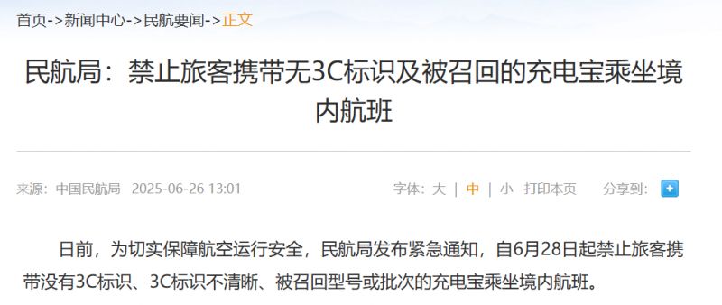 为切实保障航空运行安全,民航局发布紧急通知,自6月28日起禁止旅客携带没有3C标识、3C标识不清晰、被召回型号或批次的充电宝乘坐境内航班。