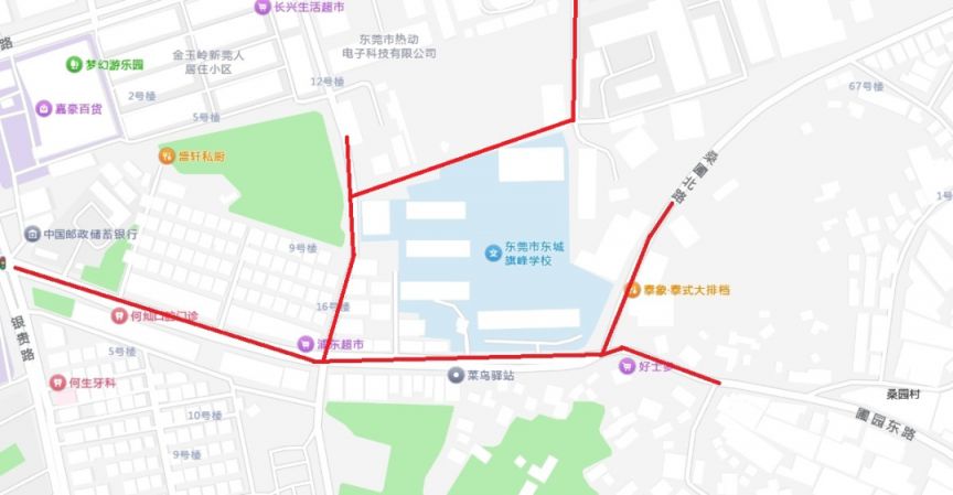 管制路段五:东莞市东城旗峰学校,涉及路段区域有:圃园东路、桑圃北路、金龙路、金中路、规划一路。