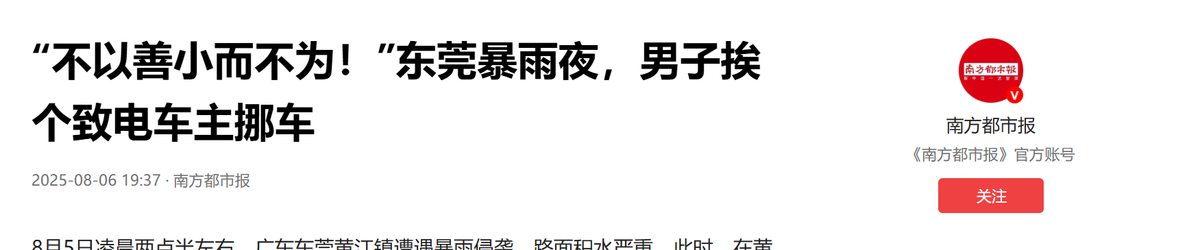 (信息来源:南方都市报——“不以善小而不为!”东莞暴雨夜,男子挨个致电车主挪车)