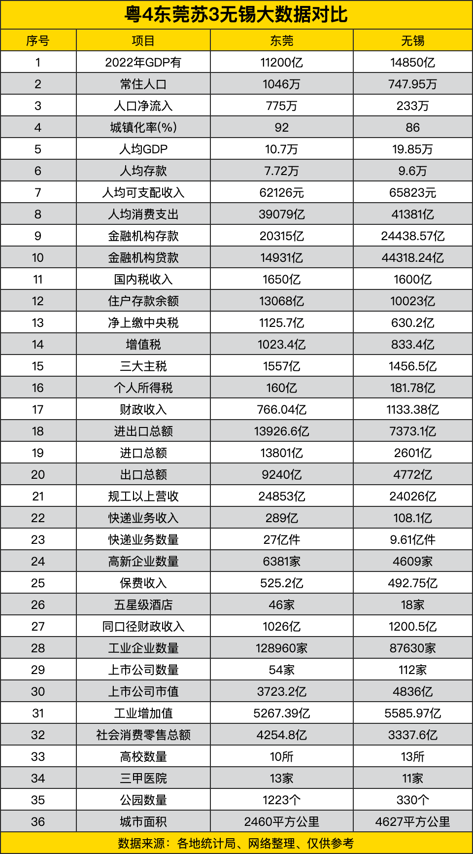 东莞和无锡的对比数据,发现这两座城市的发展模式特别有意思!东莞在人口总量上优势明显,常住人口比无锡多出近300万,特别是人口净流入高达775万,显示出强大的吸引力。不过在人均数据上,无锡明显更胜一筹,人均GDP接近20万,比东莞高出近一倍,人均存款和可支配收入也领先。