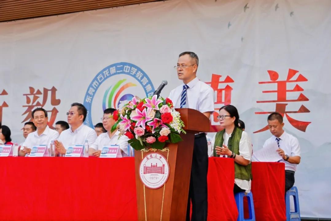 在庄严的奏唱国歌仪式后,学校党总支书记林宗庆深情回顾了学校53载奋斗征程。从1972年创办之初的简陋平房、泥土操场,到如今获评东莞市品牌学校、东莞市石龙第二中学教育集团龙头学校的现代化校园,他以“师生共同运红土建操场”的创业故事,生动诠释了“艰苦奋斗、吃苦耐劳、低调务实、心聚一处”的二中精神。